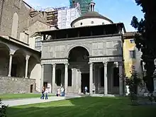 Renæssancen inden for arkitektur blev i Italien introduceret med et revolutionært, men ufuldstændigt monument i Rimini af Leone Battista Alberti[24], men perioden blev udviklet i Firenze. Nogle af de tidligste bygninger som viste renæssancens karakteristiske træk var Filippo Brunelleschis Ospedale degli Innocenti, et hittebørnsherberg, (opført 1421-1444) der regnes til de første renæssancebyggerier, derpå fulgte San Lorenzos kirke og Pazzi-kapellet, bygget mellem 1430 og 1444, som havde et bemærkelsesværdigt træk i facaden hvor de to sidefelter i porticoen er forenet i en central bue.