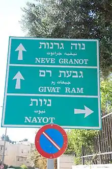 Vejskilt med hebraisk og arabisk tekst, translittereret til latinske bogstaver.