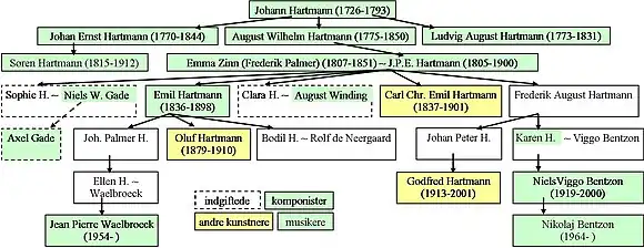 Hartmann-slægten i musikkens og kunstens tjeneste omfatter farfaderen komponisten Johann Hartmann, der indvandrede fra Tyskland, onklen Johan Ernst Hartmann, faderen August Wilhelm Hartmann samt J.P.E. Hartmanns søn, komponisten Emil Hartmann.[3] Dertil kan lægges, at datteren Sophie giftede sig med komponisten Niels W. Gade[3] og en anden datter Clara med komponisten August Winding.[3] Komponisten Niels Viggo Bentzon, hans søn jazzpianisten Nikolaj Bentzon samt den belgiske komponist Jean Pierre Waelbroeck udgør de seneste skud på stammen. Emil Hartmanns datter Bodil Hartmann gift de Neergaard, holdt fra 1885 til 1959 musikalske sammenkomster på herregården Fuglsang mellem Nykøbing Falster og Nysted på Lolland. Her deltog bl.a. Edvard Grieg og Carl Nielsen. Dertil kan man nævne Bodils broder Oluf Hartmann, der var maler, og til hvis begravelse Carl Nielsen skrev Ved en ung kunstners båre, Niels Viggo Bentzons to fætre Jørgen og Johan samt N.W. Gades søn af 2. ægteskab, Axel Gade. De var alle tre noget ved musikken.