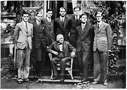 ![]() Johannes Steenstrup (siddende) og en gruppe historiestuderende fotograferet i efteråret 1934. De studerende er (fra venstre): Ib Koch-Olsen, Sven Henningsen, Roar Skovmand, Aage Hartvig Andersen, Troels Fink, Kjeld Winding og Jørgen Steining. Foto: Fotograf ukendt | |