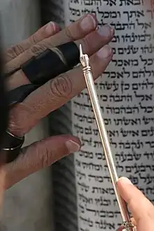 Mens en forlæser eller rabbiner under gudstjenester kører jaden langs toraens tekstlinjer, og teksten fremføres i et messende toneleje (lejnen), efterprøver en assistent, som har teksten i den stiplede udgave foran sig, chazzanens foredrag på nøjagtighed og korrigerer efter behov. Antikke jader er eftertragtede samlerobjekter for samlere af judaika.