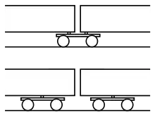 Skematisk fremstilling af Jakobs-bogie (øverst) og konventionelle bogier (nederst)
