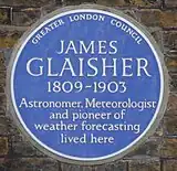 Glaisher boede på 20 Dartmouth Hill, Blackheath, London, hvor der er en blå plakette i hans minde.