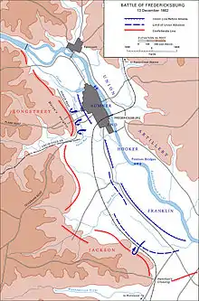 I december havde Longstreets armekorps en afgørende rolle i Slaget ved Fredericksburg. Longstreet opstillede sine mænd bag en stenmur på Marye’s Hights og afviste 14 angreb fra Unionshæren. Ca. 10.000 unionssoldater faldt, mens Longstreet kun mistede 500. Hans store defensive succes var dog ikke alene baseret på det fordelagtige terræn. Longstreet huskede på hvordan nedslagtningen ved Antietam var blevet forstørret af manglen på defensive stillinger, og derfor havde han beordret, at der skulle graves skyttegrave og bygges skanser, hvilket dannede skole for de fremtidige defensive slag Army of Northern Virginia udkæmpede.[23]