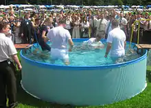 Herefter døbes man til et af Jehovas Vidners stævner. Ved dåben sænkes kandidaten helt ned i vand, som beskrevet i Bibelen.