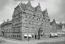 Stenhuset er en renæssancebygning, inspireret af hollandsk renæssance, der består af fem etager; stuen var boder, 1. etage bolig, 2. etage kamre og øverste etage var kornkammer. Husets hovedfacade har tre vælske gavle, ligesom hver endegavl også er vælsk. Husets facader er inddelt af vandrette sandstensbånd. Under vinduernes bueslag findes maskehoveder i bruskbarok. Den otte-kantede karnap med kuppeltag på facaden er tilføjet senere[lower-alpha 1]. Dele af stenhuset blev i 1917-19 restaureret af arkitekten Harald Lønborg-Jensen, som genskabte de manglende endegavles udsmykning. I 1993-94 blev gavlenes og profilbåndenes sandsten fornyet.