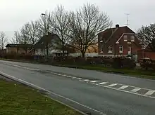 Vejen er tosporet med én kørebane i hver retning og fortov i begge sider.
