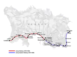 To jernbaner, Jersey Western Railway[25] i 1870 og Jersey Eastern Railway[26] i 1874, blev åbnet. Den vestlige jernbane strakte sig fra St Helier (Weighbridge) til La Corbière og den østlige jernbane fra St Helier (Snow Hill) til Gorey Pier. De to jernbaner er aldrig blevet forbundet. Busser begyndte at køre på øen i 1920'erne, og jernbanerne kunne ikke klare konkurrencen. Den østlige jernbane lukkede i 1926 og den vestlige jernbane i 1936 efter en brandkatastrofe samme år.