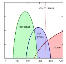 Graf over optimal anvendelighed af (venstre til højre) turboshaft, low bypass og turbojet ved flyvning omkring 10 km højde ved forskellige hastigheder. Vandret akse – hastighed, m/s. Lodret akse har kun logisk mening.
