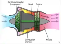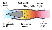 Den komprimerede luft ledes nu videre til et brændkammer. Her tilføres jetbrændstof, som forbrændes i det større lufttryk. Denne proces producerer en stor mængde varme og luftens volumen udvides betragteligt. Dette giver et forøget tryk, som forsætter ud af brændkammerets agterende, hvor en konvergent kanal omdanner lufttrykket til hastighed.