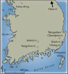 De vigtigste kendte fundsteder er Amsa-dong i Seoul, Sopohang (Rason), Gado (Jeonbuk), Osan-ri (Gangwon), Sejuk-ri (Ulsan) og Dongsam-dong i Busan.