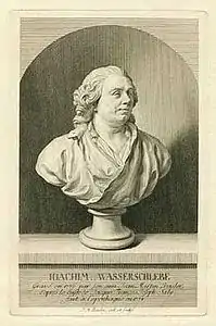 ![]() Joachim Wasserschlebe, stukket af J.M. Preisler efter buste af Jacques-François-Joseph Saly | |