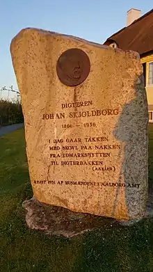 I 1934 blev der opstillet en buste af ham i Mølleparken ved Århus Folkebibliotek med indskriften Johan Skjoldborg, Husmændendes Digter. Du kendte vort Liv og forstod det.
