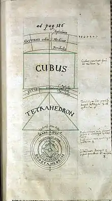 Johannes Keplers første større astronomiske værk, Mysterium Cosmographicum ("Det Kosmografiske Mysterium"), blev først udgivet som forsvar for det kopernikanske system. Kepler hævdede at have haft en åbenbaring 19. juli 1595, mens han underviste i Graz og demonstrerede Saturn og Jupiters konjunktion i dyrekredsen; han indså, at regulære polygoner har en indskreven og en omskreven cirkel i bestemte forhold, hvilket han mente kunne være universets geometriske basis. Efter ikke at have kunnet finde et unikt arrangement af polygoner, som passede ind i kendte astronomiske observationer (selv med ekstra planeter føjet til systemet), begyndte Kepler at eksperimentere med tredimensionelle polyedre. Han fandt frem til, at hvert af de fem platoniske legemer unikt kunne indskrives og omskrives af sfæriske kugler; at lægge disse legemer, hver indkapslet i en sfære, inde i hinanden ville give seks lag, hvilket svarede til de seks kendte planeter — Merkur, Venus, Jorden, Mars, Jupiter og Saturn. Ved at ordne legemerne korrekt — oktaeder, ikosaeder, dodekaeder, tetraeder, terning — fandt Kepler, at sfærerne kunne placeres i intervaller, der (indenfor de begrænsninger for nøjagtighed som datidens astronomiske observationer havde) svarede til de relative størrelser på hver planets vej, forudsat at planeterne kredsede om Solen. Kepler fandt også en formel som omhandlede størrelsen på hver planets kugle relativt til længden på dens omløbstid: fra inderste til yderste planeter er forholdet af stigning i omløbstid det dobbelte af forskellen i kugleradius. Kepler afviste dog senere denne formel, fordi den ikke var præcis nok.[13]
