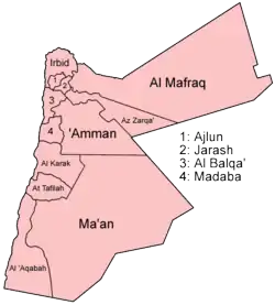 - "The Hashemite Kingdom of Jordan Department of Statistics (DOS), 2007 Year Estimation of Population by (provins) and Sex". Arkiveret fra originalen 7. maj 2010. Hentet 17. april 2015.