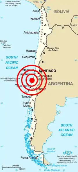 Man mærkede også skælvet i hovedstaden Santiago de Chile og også i nogle byer i Argentina. I Santiago brød nogle bygninger sammen, der var strømbrud i nogle bydele, og den internationale lufthavn måtte lukkes ned.