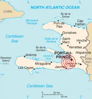 25 km vestsydvest for Haitis hovedstad Port-au-Prince 18°27′5.04″N 72°26′42.72″V  |