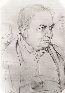 Joseph Anton Koch i Osteria. Fra højre: Johann Christian Reinhart, maler Müller, Johann Martin von Rohden med Joseph Anton Koch som opvarteren (der Kelner) - alle tyske malere; en karikatur af Bonaventura Genelli.