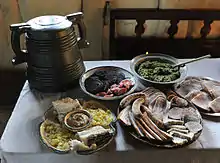 - Brunkager, gløgg, honningkage, julebagning, julebryg, juledrømme, julefrokost, julegris, julegås, juleknas, julemiddag, julesalat, juleøl, jødekager, klejner, pebernødder, risengrød, risalamande, nisseøl, vaniliekranse og æbleskiver.