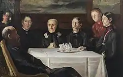 Kvinderne på maleriet er fra venstre mod højre[4] Marie Brøndum, Hulda Brøndum, Ane Hedvig Brøndum, Helga Ancher og Anna Ancher, omkring et bord i Brøndums Hotels spisesal. Ane og de to ældre søstre drev sammen med broderen, Degn Brøndum, Brøndums Hotel.