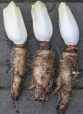 Mørkedrevne skud af Almindelig Cikorie, "julesalat".