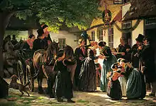 Besøget hos bedstefaderen er en yndefuld idyl, en mild og elskværdig fortælling om gode mennesker, der er glade for hinanden. Hvad grundtonen angår, har det mange sidestykker i Exners produktion, således de almindelig kendte Et besøg af små fætre og kusiner hos den lille nydøbte, En lille pige lader en gammel mand lugte til en rose og Den lille rekonvalescent. Amagergildet skylder en stor del af sin virkning til den dygtighed, hvormed figurerne er stillede i forhold til hinanden og bevægede i de mest forskellige stillinger. Særlig værd får det desuden ved det gode humør, der hviler over det hele. Exner er ingen satiriker, hans lune er uden brod og viser sig også i mange af hans senere frembringelser, som Den forstyrrede middagshvile og Præsentation for en kender. Til sidstnævnte billede har Exner gjort studierne på Fanø, hvis folkeliv i hans senere år interesserede ham stærkt. Af sine ophold i udlandet har han haft forholdsvis ringe, direkte udbytte. Fra rejser i Sverige hjembragte han vel adskilligt kønt, men sydens herligheder – han var i 1854-1858 i Italien med Akademiets støtte – synes ikke at have kunnet påvirke ham.