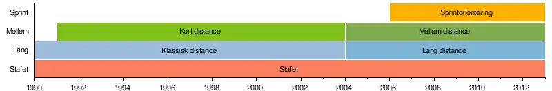 Der konkurreres i fire discipliner, en langdistance, en mellemdistance, en sprintdistance og en stafet. Oprindeligt var der kun to discipliner, klassisk og stafet. Oprindeligt var der kun to discipliner, klassisk og stafet. I 1991 kom der en kort distance med, som dog i 2004 blev erstattet af en mellemdistance. I 2006 kom sprintorientering med på programmet.
