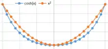 På figuren er vist en cosh-kurve og en parabel. Den orange kurve (parablen) kan f.eks. repræsentere et bærekabel på en hængebro, hvor kablet hænger fast på toppen af de to bropyloner, og hvor kablet er belastet med brofag (brofagene er dog ikke tegnet på figuren). Den blå kurve (cosh-kurven) repræsenterer så den kurve som et løst og ubelastet kabel vil have, hvis det er hængt op i pylonerne således, at det tangerer brodækket på midten. For at kunne nå helt ned til brodækket må det frithængende kabel være lidt længere end bærekablet, da de to kabler følger lidt forskellige kurver.
