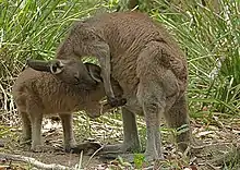 Unge af grå kæmpekænguru (Macropus giganteus), der med hovedet i pungen dier hos sin mor. Parret er fotograferet i Murramarang Nationalpark i New South Wales, Australien.