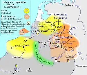 ![]() Udbredelse af Saliske frankere og Ripuariske frankere i det 5. - 6 århundrede.  | ||