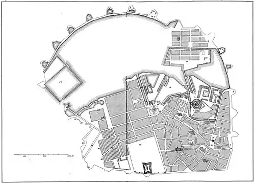 Bemærk at målestokken på kortet er angivet i alen, og at op på kortet er øst, ikke nord som på de fleste kort.
