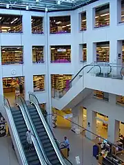 Biblioteket er i fem etager, forbundet med hinanden via elevatorer og rulletrapper, der er placeret ud mod et overdækket gårdrum. Etagerne huser hver sin egen afdeling; Nye materialer finder man i stuen samt udlån og afleveringsmaskiner. Før var der også her aviser, som man kunne sidde og læse i, men de blev rykket op på 4. sal, pga. pladsmangel. På 1. og 2. sal finder man KLM (Kunst, litteratur og musik) samt på 2. sal børneafdelingen. På 3. og 4. sal finder man vidensafdelingen. Humaniora, samfundsfag, geografi, teknik, natur og medicin finder man på 3. sal, mens historie findes på 4. sal (hvor der i øvrigt er stillezone). Dansk og udenlandsk Skønlitteratur finder man på 1. sal. Stueetagen inkluderer en række nye funktioner, som er blevet indpasset i huset siden 1993, herunder Det Kulørte Bibliotek (et tegneseriebibliotek) med tilhørende café, som i første omgang var på prøve, men hvis ordning nu er blevet gjort permanent.[2] Udlån kan foretages i hver afdeling. Etagerne har ud mod midterpartiet store vindues lignende åbninger, der giver den besøgende et stort overblik over hele huset.[3] Derudover findes en læsesal (2. sal), avislæsesal (4. sal) med adgang til fysiske og digitale udgaver, informationen (stuen) og hver etage rummer computere til informationssøgning. Derudover kan man finde webværkstedet på 4. sal, hvor man kan låne computere til fx brug af photoshop el.lign.