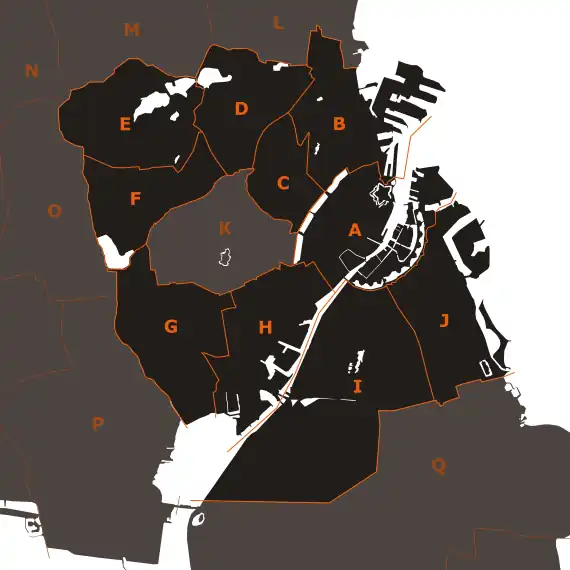 Den administrative opdeling adskiller sig fra den funktionelle opdeling, hvor man i daglig tale opererer man med en lidt anden opdeling, der fra centrum og mod uret rundt (som på kortet) inkluderer Christianshavn, Indre By, Østerbro, Nørrebro, Nordvest, Brønshøj, Husum, Vanløse, Valby, Sydhavnen, Vesterbro, Islands Brygge og Amager. Amager og Islands Brygge ligger på Amager, Christianshavn mellem Amager og Sjælland, og de resterende bydele ligger alle på Sjælland.