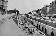 Voldene omkring København ophørte i 1856 med at være byens grænse, og det blev nu tilladt at bygge permanent, grundmuret byggeri mellem Søerne og Jagtvej, med ophævelsen af demarkationsservitutten. Der lå allerede en del byggeri i området, som Blågård, gartnerier og blegedammene, men som udgangspunkt havde man hidtil ikke måttet bygge grundmuret byggeri, da man i tilfælde af krig og belejring havde skullet kunne rydde området hurtigt. Tilladelsen til grundmuret byggeri i kombination med en meget liberal byggelovgivning førte til et byggeboom i brokvartererne, Nørrebro og Vesterbro (fra 1850'erne), Østerbro (fra 1880'erne), Amagerbro (fra 1890'erne) og Islands Brygge (fra 1905) og en betydelig forøgelse af indbyggertallet. Omkring 1800 boede der cirka 100.000 mennesker i hovedstaden, og omkring 1900 boede der næsten 500.000.[77] Den meget kraftige forøgelse i indbyggertallet fulgtes af en afgrundsdyb forskel mellem de dekorerede facader mod gaden og de mørke baggårde.[78]