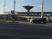 Køge Stadium under ombygningen i december 2018. I baggrunden kan Køges vandtårn ses, og bagved den nye tribune kan de tilbageværende dele af det gamle stadion ses.