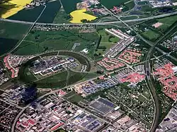 Sjællands Universitetshospital, Køge fra oven placeret i cirkel omringet af skov, som nu er blevet fældet.