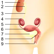 1. Nyre, 2. Nyrebækken, 3. Urinrør, 4. Æggeleder, 5. Æggestok, 6. Livmoder, 7. Urinblære, 8. Livmoderhals, 9. Vagina