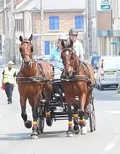 - Dressur, som ved dressurridning bedømmes kuskenes evner til at styre hestene og få dem til at gå i holdning. Oprindeligt indeholdt programmerne kun skridt og trav, men det er udvidet til galop i de svære klasser.