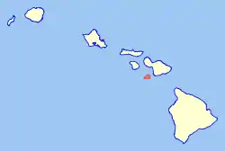 ![]() Kahoʻolawe Kort over Hawaii, med Kahoolawe markeret med rødt. | |