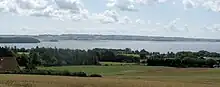 Kalø Vig set fra Trehøje i Mols Bjerge; forrest Knebel Vig og til venstre Skødshoved, i baggrunden Studstrupværket