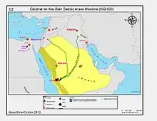 | De fire retledte kaliffer iflg. sunni: | 632-661 | Abu Bakr (632-634) Umar ibn al-Khattab (634-644) Uthman ibn Affan (644-656) Ali ibn Abi Talib (656-661) Syrien, Mesopotamien, Persien og Egypten erobres |
