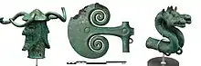 Det samme er tilfældet for de to heste, der står side om side. De er et velkendt symbol fra bronzealderen, der kombinerer slangekrop og hestehoved.[4]