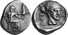 Kallisto (t.h.) på sølvmønt fra Tegea i Arkadien, ca. 460-450 f.Kr. Zeus (t.v) på sin trone.