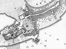 - Tegning Niels Termansen af Vor Frue kirke og Kalundborg Slot i Kalundborg lokalarkiv