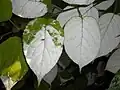 Knopperne sidder spredt og skjult under bladfoden, som bliver siddende ved løvfald. Bladene er ægformede med savtakket rand og lang spids. Ved løvspring er de grønne, senere farves spidserne hvide, og til sidst bliver spidserne røde. Høstfarven er gul.