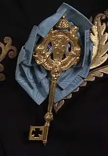 Kammerherrer "i tjeneste" bærer en rød uniform med en kammerherrenøgle på højre frakkeskøde.