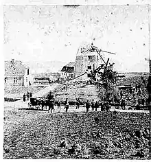 Bag skansens brystværn ses fra venstre chefen for 1. brigade oberst Georg Henrik Lasson, chefen for 2. division, generalmajor Glode du Plat med pelsforet kappe og ritmester a la suite greve Henrik Moltke-Huitfeldt med kikkert.[20]