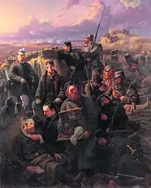 ![]() I Dybbøl Skanser i April 1864. Maleri fra 1871 af Jørgen Valentin Sonne  |