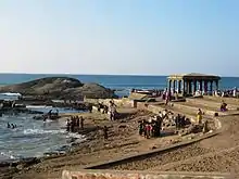 Omkring 15 meter ude i vandet ligger en 25 × 40 m stor afrundet klippe, kaldet skildpaddestenen. Mod øst, henholdsvis 350 m og 500 m ude i vandet ligger to lidt større klippeøer. På den første står den 40 m høje Tiruvalluvar-statue, og på øen længest væk ligger Vivekananda templet. Der er færgeforbindelse til de to øer.