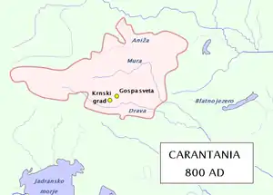 Omkring år 600 e.Kr. bosatte slaverne sig under avarernes herredømme i regionen, der blev hærget under folkevandringstiden. De oprettede et selvstændigt hertugdømme omkring 630. Mellem 741-765 søgte slaverne hjælp i nabolandet Bayern, for at frigøre sig fra det avariske styre, og måtte i stedet underkaste sig Bayern.